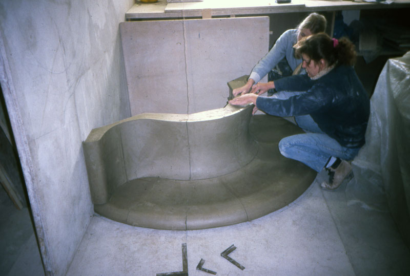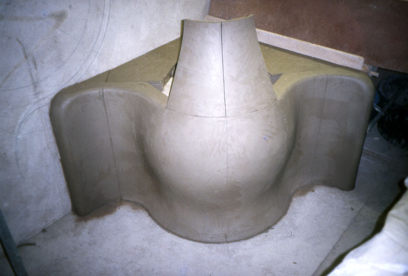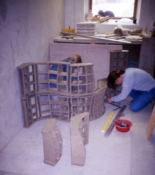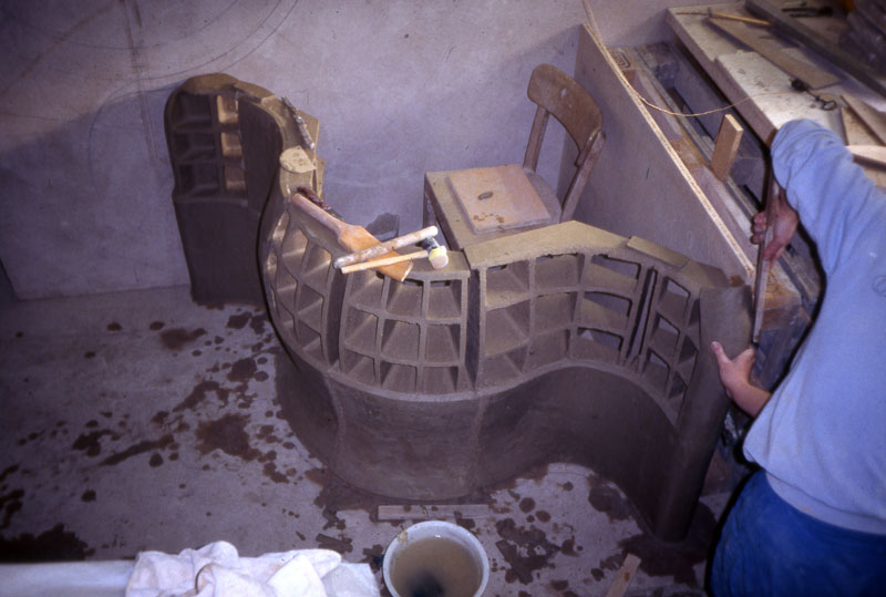 Der Ofenkörper wird als Ganzes im halbfeuchten Zustand wie eine Skulptur aufgebaut und nach Vollendung in Einzelsegmente zerschnitten.